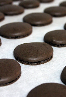 My first attempt was the Bailey's and coffee. Tasted great but did not look very macaron-y. The "feet" did not really form at all and they were very pointy.